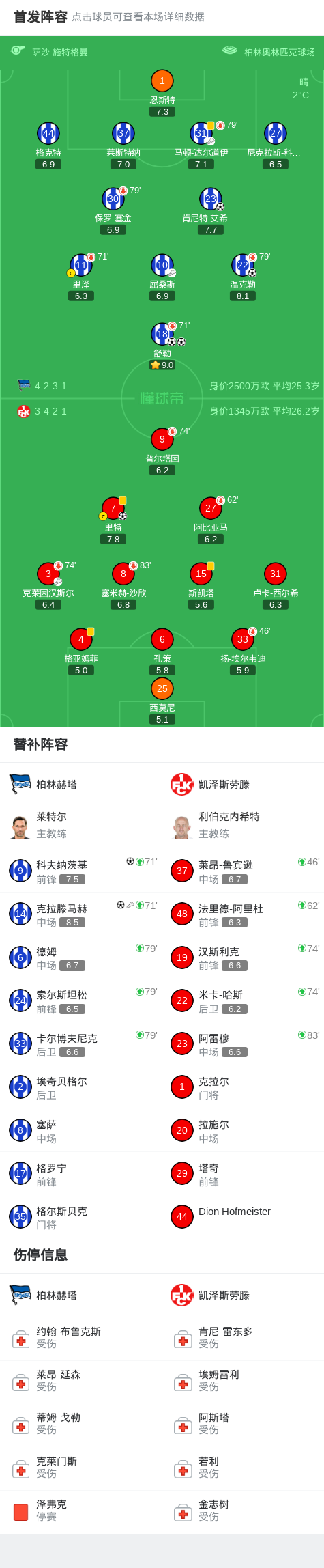 北京时间12月3日德国足协杯 第三轮,柏林赫塔对阵凯泽斯劳滕。柏林赫塔舒勒梅开二度,温克勒破门,肯尼特-艾希霍恩破门,科夫纳茨基破门,克拉滕马赫破门。凯泽斯劳滕里特破门。最终比分柏林赫塔 6-1 凯泽斯劳滕。
