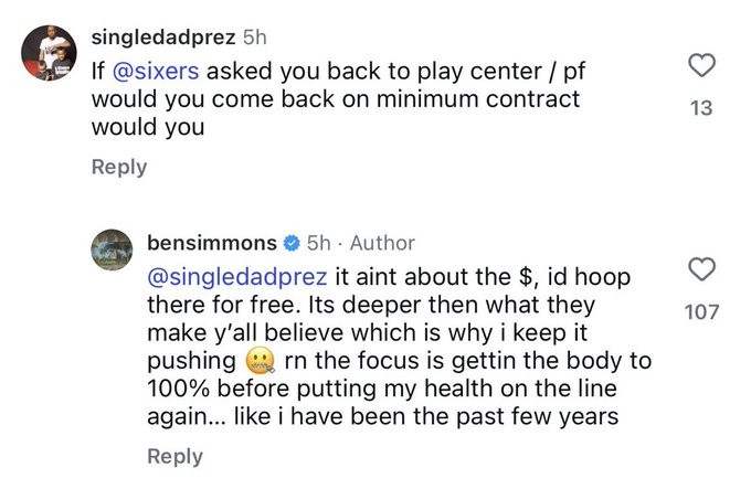 扫描下载懂球帝首页>动态> 忠肝义胆,本-西蒙斯:为76人打球不是钱的问题,我愿为他们免费效力