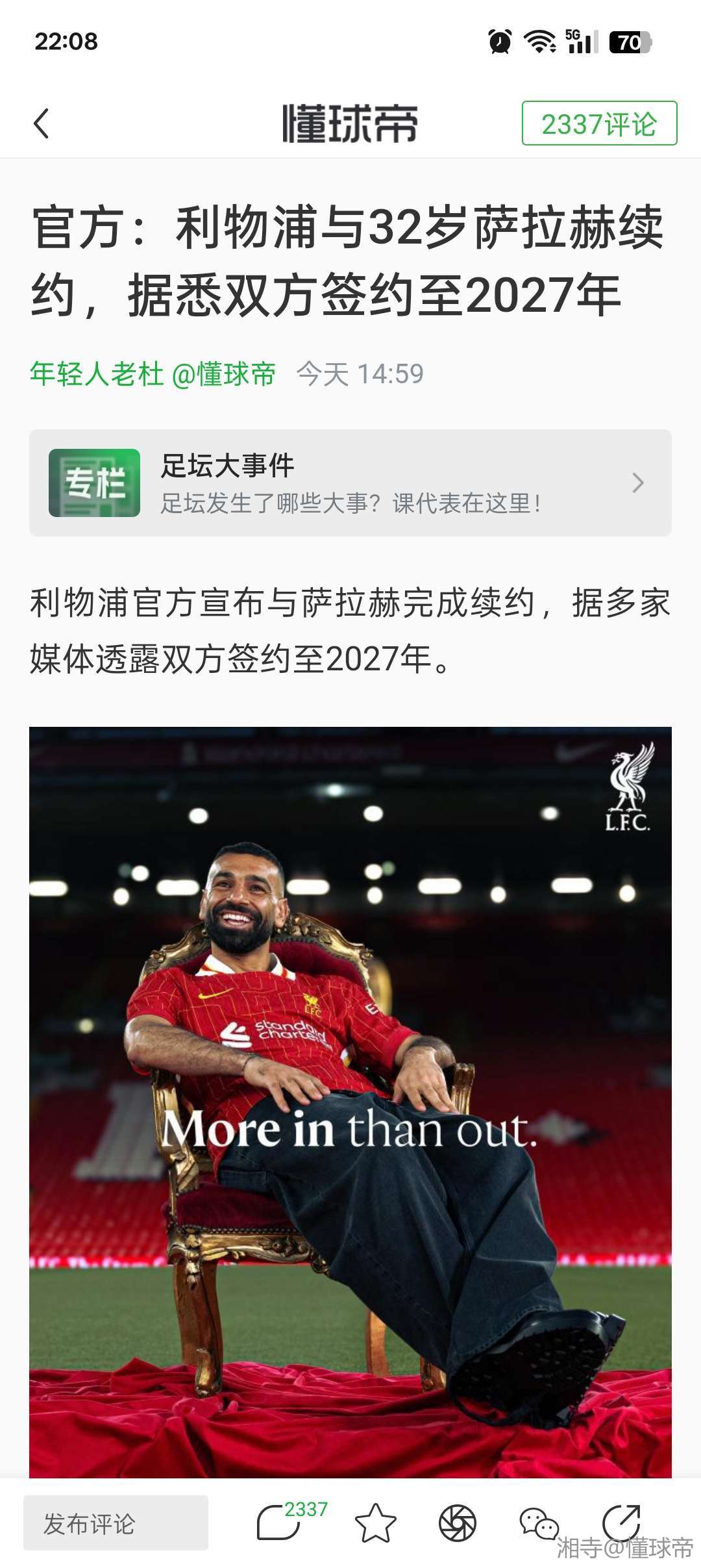 我的红军哥们前两天还念叨着非洲杯赶紧来送走法老,今天晚上就在这说非洲杯的不是了哈哈哈,法老在利物浦球迷心中地位还是非常高的