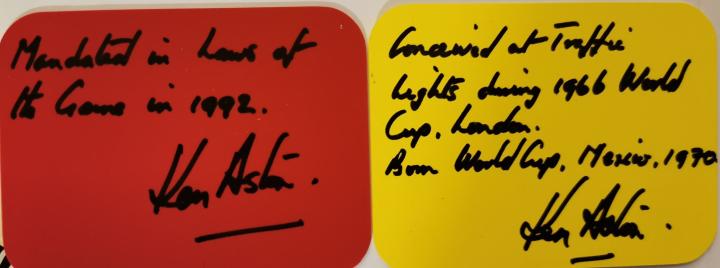 回到家之后,阿斯顿把自己的想法和妻子希尔达进行了交流。希尔达灵机一动,去了另一个房间。几分钟后,她拿着两张用彩纸做的卡片出来了:一张红色,一张黄色,而且刚好裁剪成了能够放进衣服口袋的大小。