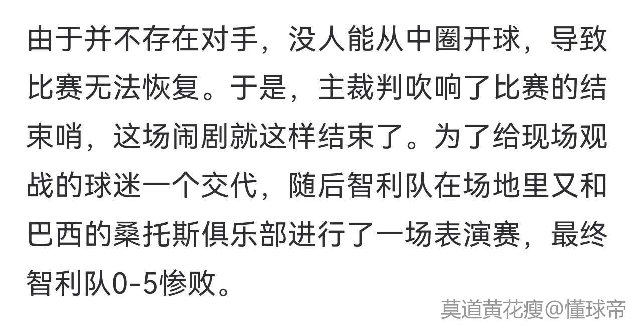 由于并不存在对手,没人能从中圈开球,导致比赛无法恢复。于是,主裁判吹响了比赛的结束哨,这场闹剧就这样结束了。为了给现场观战的球迷一个交代,随后智利队在场地里又和巴西的桑托斯俱乐部进行了一场表演赛,最终智利队0-5惨败。