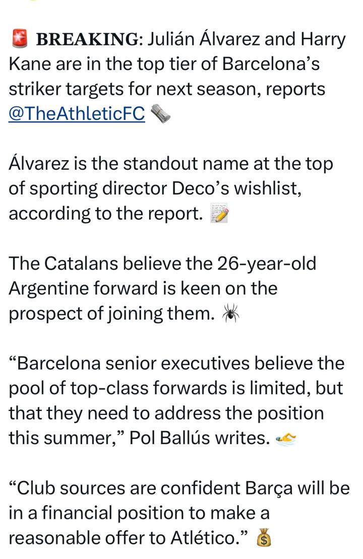 扫描下载懂球帝首页>动态> 懂球号> 阿尔瓦雷斯与凯恩位列巴萨下赛季锋线引援第一梯队?
