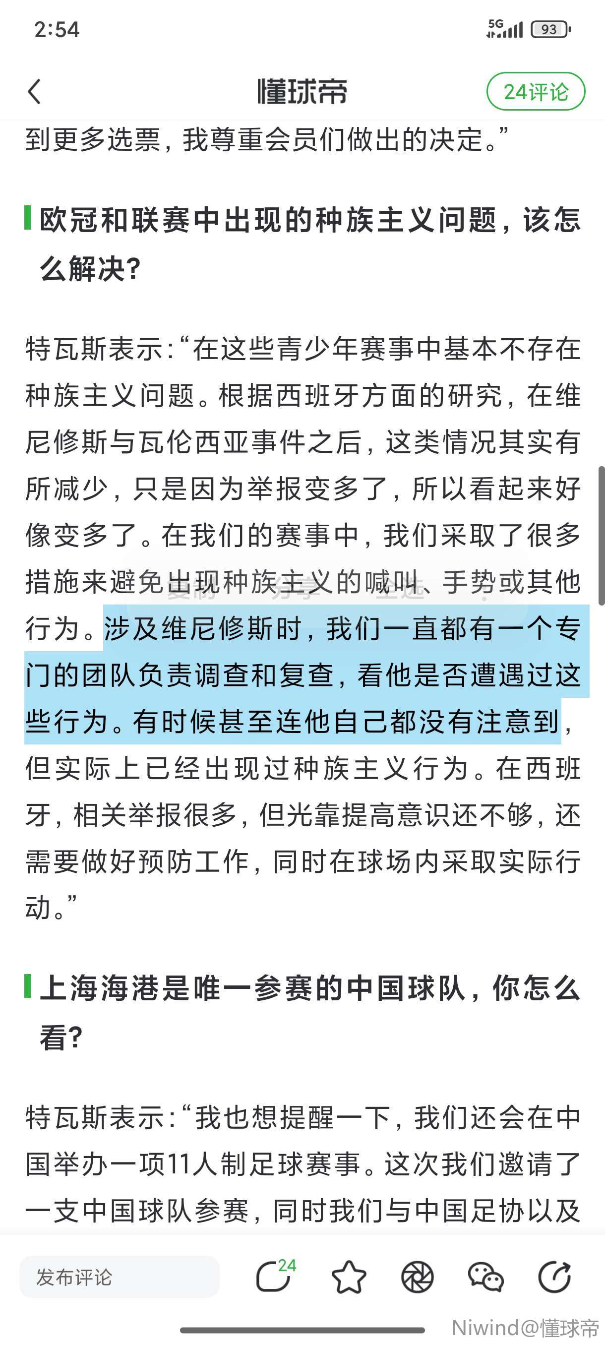 特瓦斯表示:“在这些青少年赛事中基本不存在种族主义问题。根据西班牙方面的研究,在维尼修斯与瓦伦西亚事件之后,这类情况其实有所减少,只是因为举报变多了,所以看起来好像变多了。在我们的赛事中,我们采取了很多措施来避免出现种族主义的喊叫、手势或其他行为。涉及维尼修斯时,我们一直都有一个专门的团队负责调查和复查,看他是否遭遇过这些行为。有时候甚至连他自己都没有注意到,但实际上已经出现过种族主义行为。在西班牙,相关举报很多,但光靠提高意识还不够,还需要做好预防工作,同时在球场内采取实际行动。”