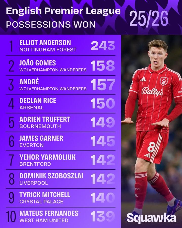 扫描下载懂球帝首页>动态> 本赛季英超赢得球权排行榜:安德森断档领先,赖斯、索博上榜