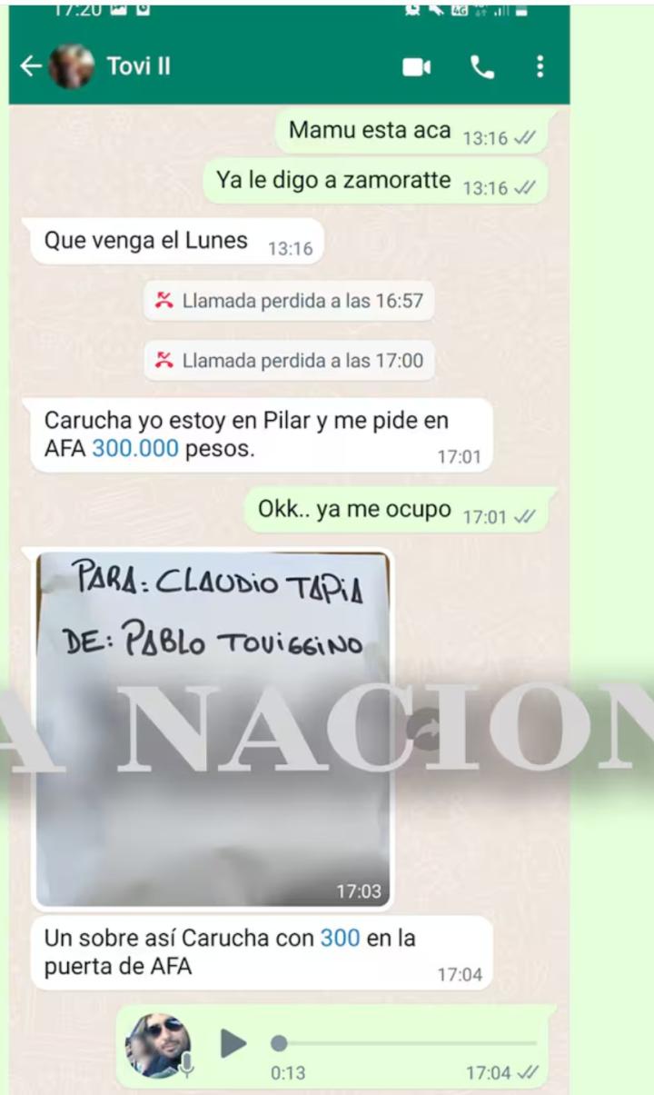 据知情人士透露,维亚蒙特街的阿根廷足协总部并非最频繁的送货点,但每当塔皮亚提出需求,托维吉诺从不拖延。2021年3月23日,他指示:“我需要20万现金,放在阿根廷足协门口,收件人克劳迪奥-塔皮亚,拍张照片给我。”