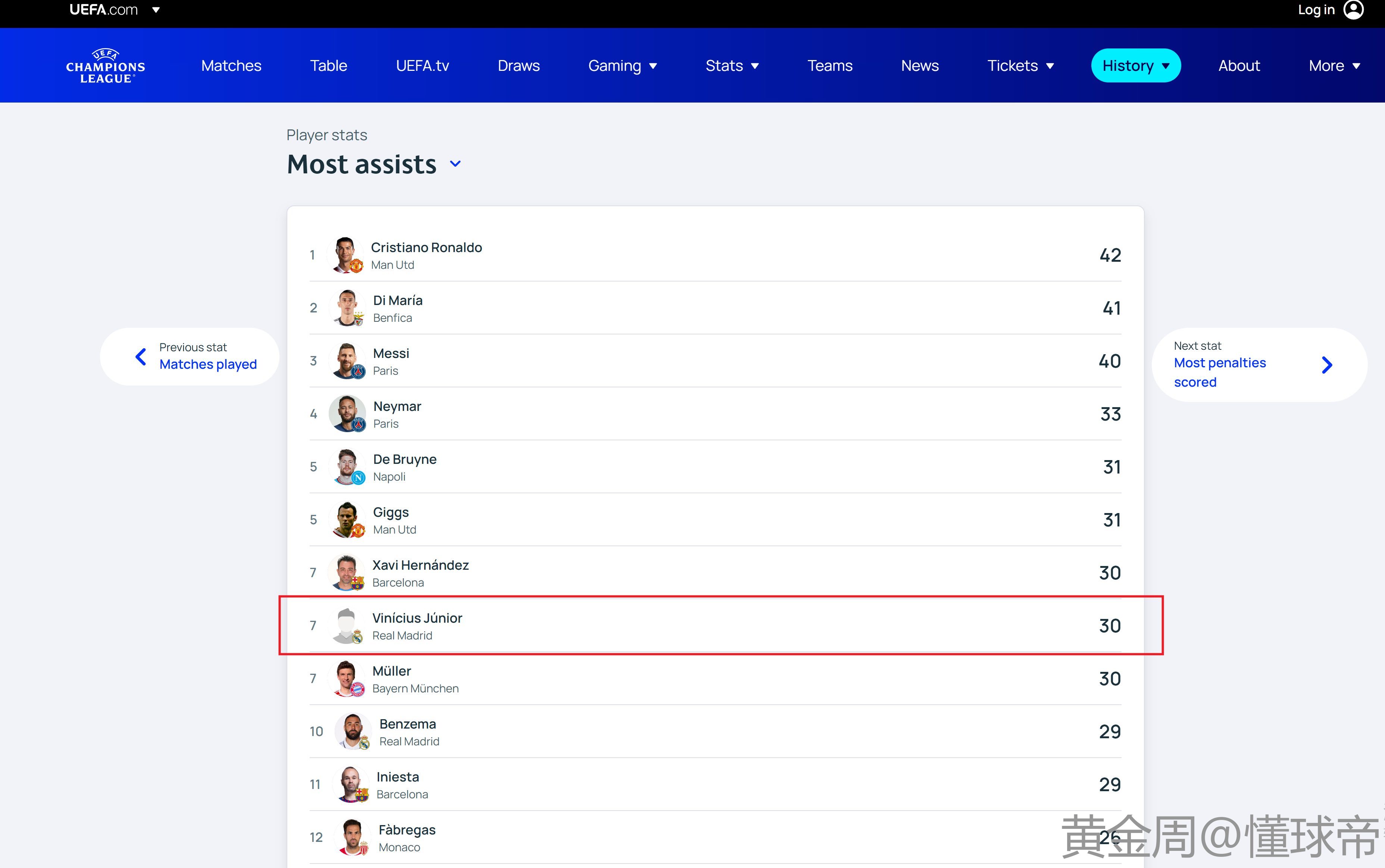 维尼仅差1助就追平罗哥在皇马效力期间欧冠31助创造皇马队史欧冠助攻王的纪录。