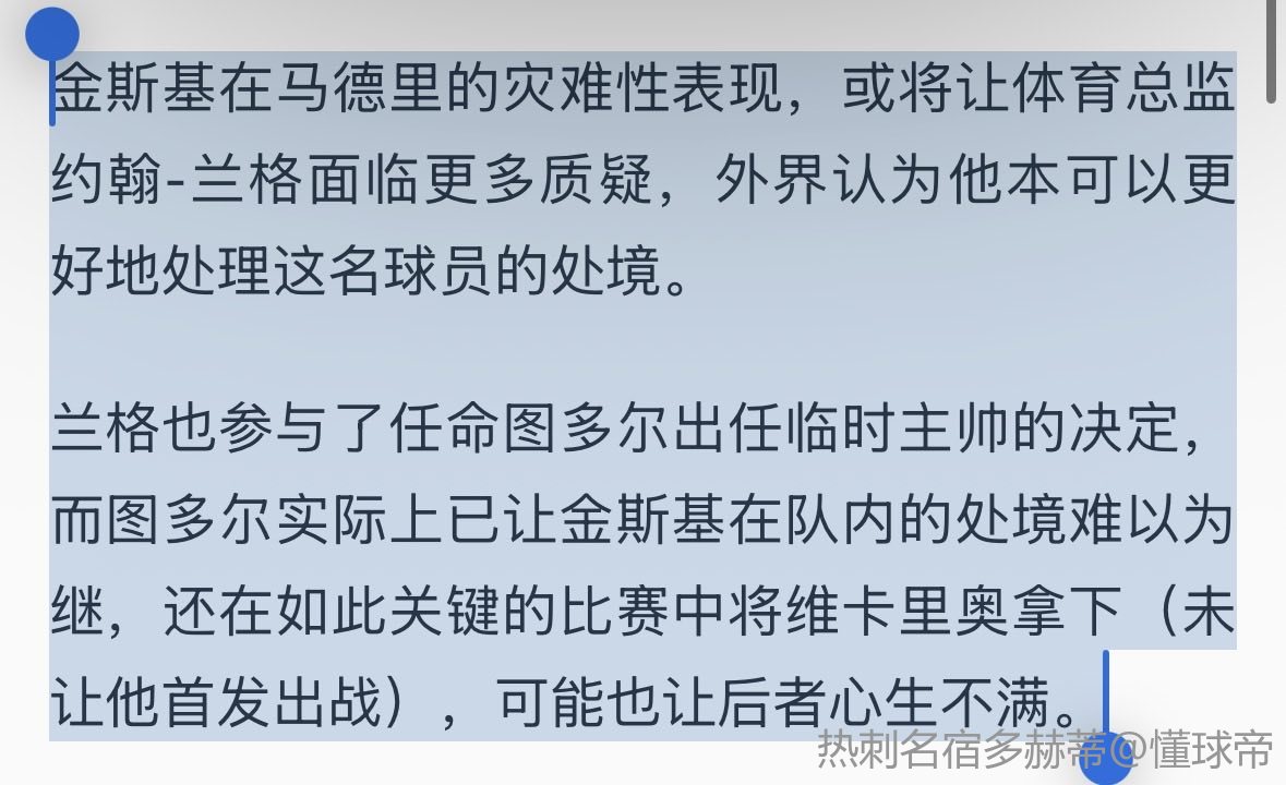 金斯基渴望稳定出场,无论是在热刺还是其他球队,这种心态或许也在他马德里的崩盘表现中起到了作用。有消息源推测,他可能把这场比赛看得过重,一旦局面失控便无法应对。