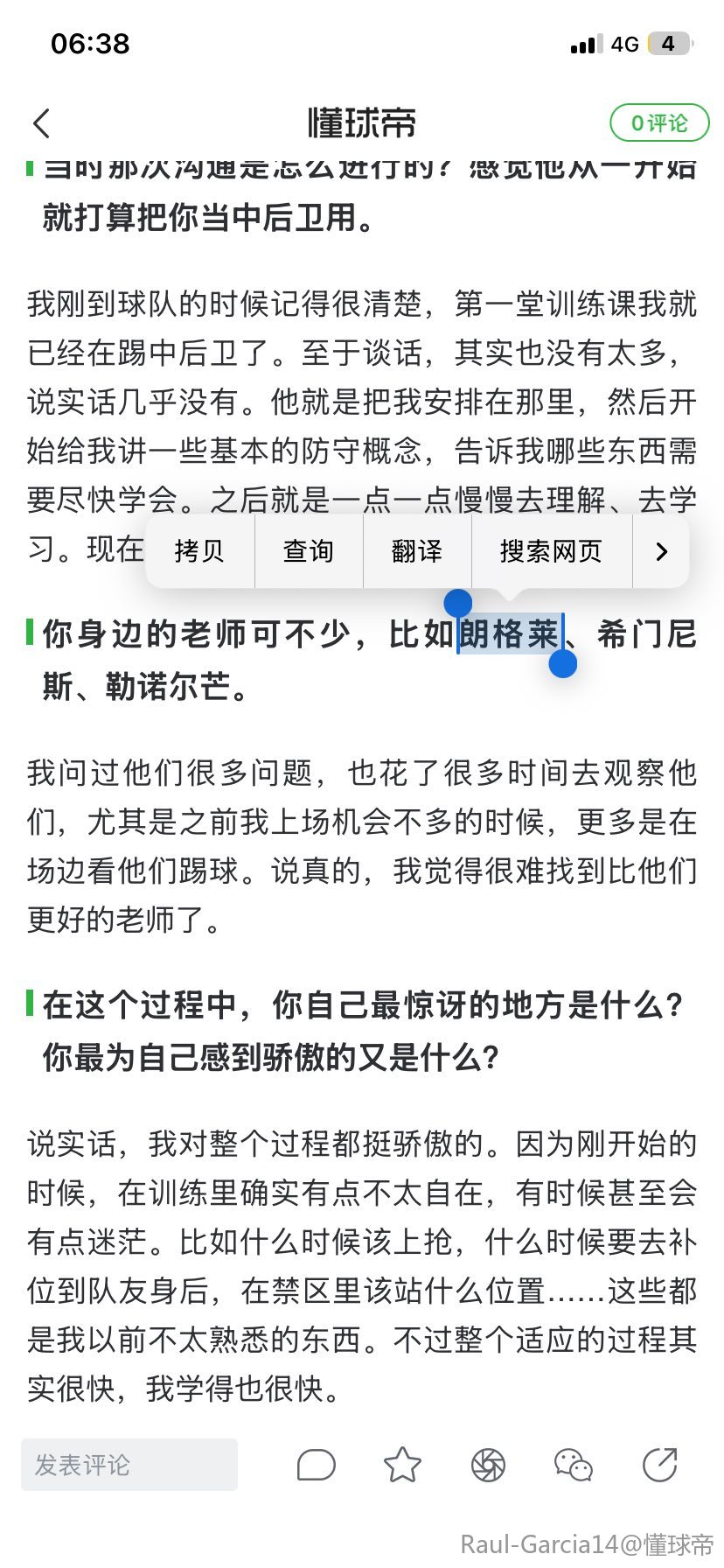 我觉得最重要的是一开始我很有耐心。我从来没有停止努力,以后也不会停止。因为我真的很热爱这一切。我喜欢训练、喜欢学习、喜欢不断进步,所以我不会停下来。确实有一个阶段我开始获得出场机会,然后就一直踢到现在。希望以后也能一直这样。