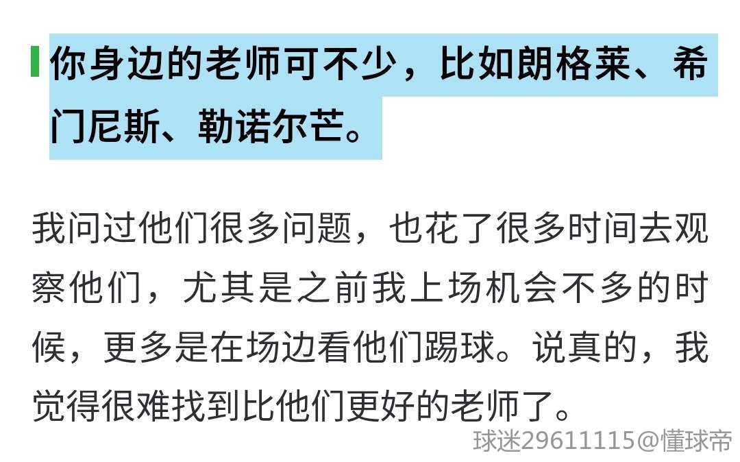 我问过他们很多问题,也花了很多时间去观察他们,尤其是之前我上场机会不多的时候,更多是在场边看他们踢球。说真的,我觉得很难找到比他们更好的老师了。