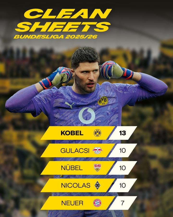 扫描下载懂球帝首页>动态> 本赛季德甲门将零封榜:科贝尔13场居首,诺伊尔7场排第五