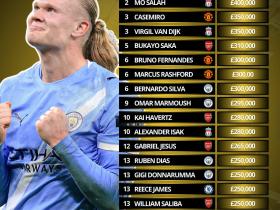 英超周薪最高球员榜单:1️⃣🇳🇴 哈兰德:52....