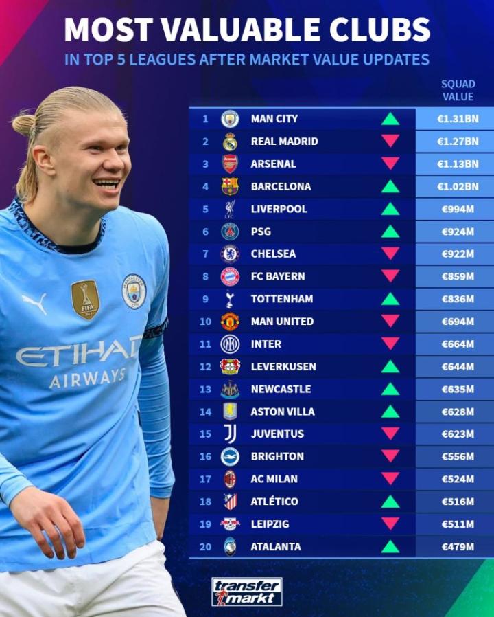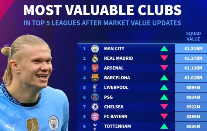扫描下载懂球帝首页>动态> 五大联赛球队最新身价榜:曼城居首,皇马、枪手紧随其后