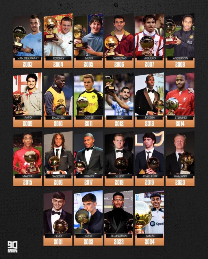 扫描下载懂球帝首页>动态> 历年金童奖得主:梅西、鲁尼、姆巴佩领衔,上届亚马尔加冕