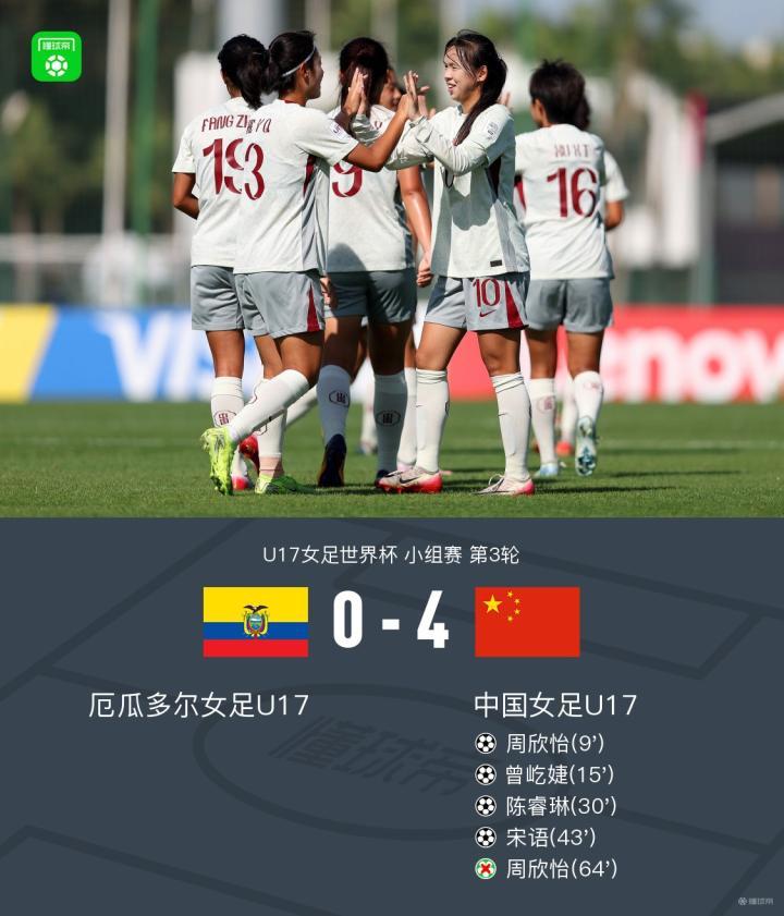 在U17女足世界杯小组赛第三轮的一场较量中,中国女足U17与厄瓜多尔女足U17展开对决。比赛开始后,中国女足U17迅速进入状态,周欣怡率先打破僵局,为中国队取得领先。随后,曾屹婕接应攻势再下一城,进一步扩大比分优势。此后,曾屹婕送出精准助攻,帮助陈睿琳推射得手,中国队连续施压收获成效。上半场临近结束前,宋语冷静破门,将领先优势继续巩固。下半场,周欣怡获得点球机会,但未能成功转化为进球。尽管如此,中国队仍将良好势头保持至终场。最终,中国女足U17以4比0战胜厄瓜多尔女足U17,顺利晋级下一阶段。
