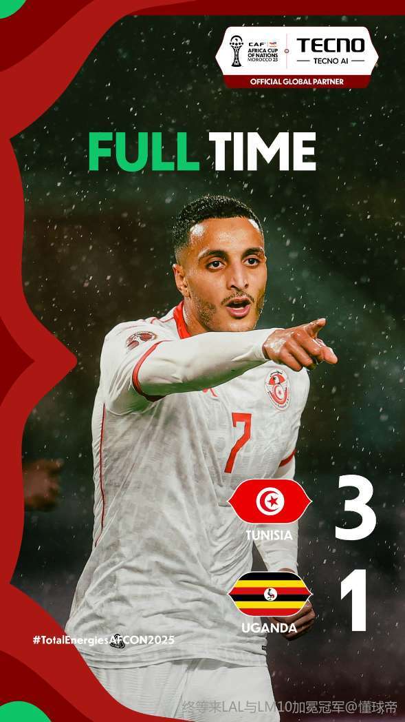 北京时间12月24日非洲国家杯 小组赛 第1轮,突尼斯对阵乌干达。突尼斯斯希里破门,阿舒里梅开二度。乌干达丹尼斯-奥梅迪破门。最终比分突尼斯 3-1 乌干达。