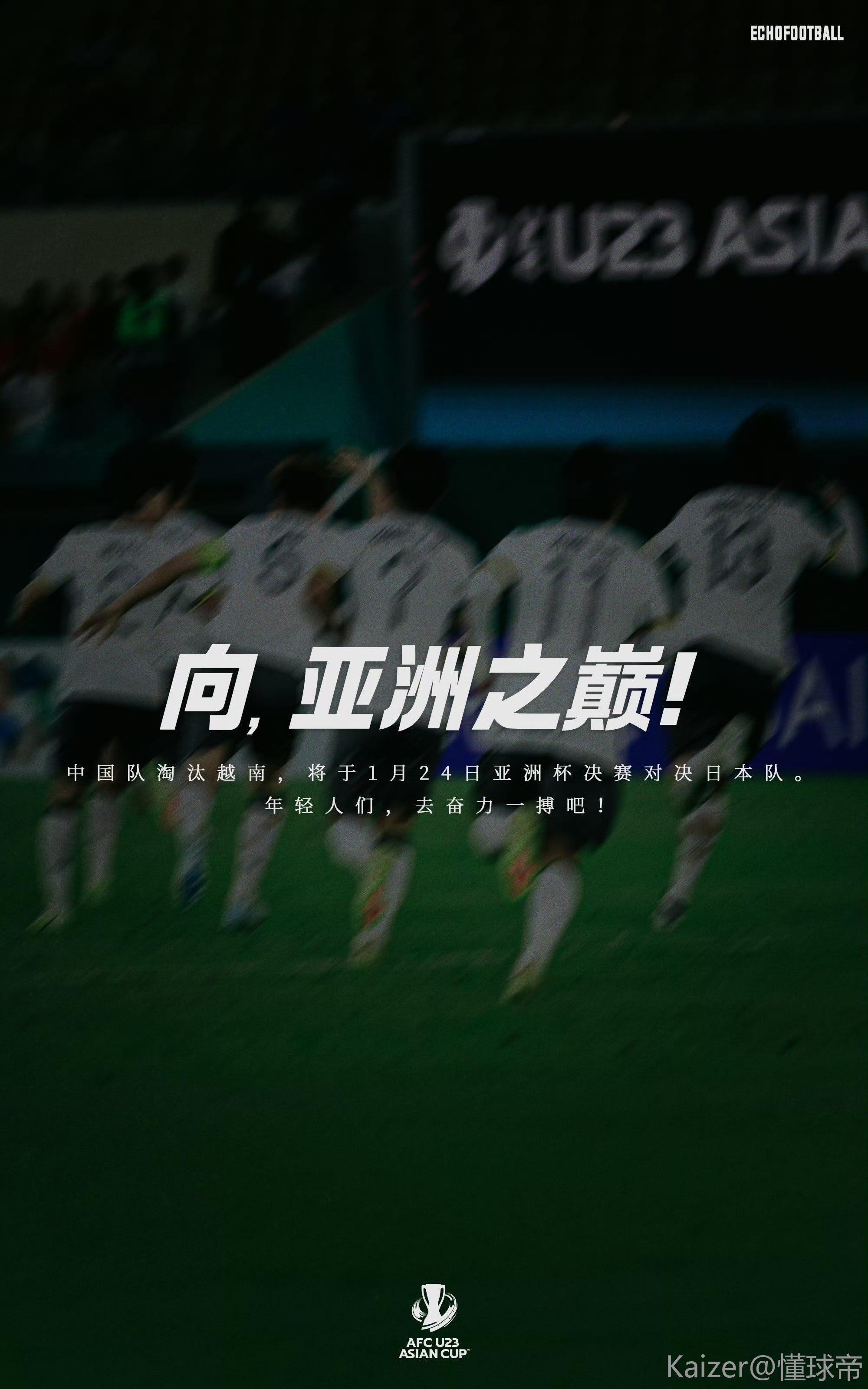 国足进了八强我觉得八强就行,之后没想到进了四强,我又觉得四强就行。现在进了决赛,我反而觉得亚军不行,我们要拿冠军!中国队加油!!
