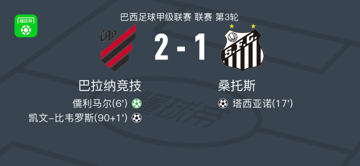 北京时间2月13日巴西足球甲级联赛 联赛 第3轮,巴拉纳竞技主场对阵桑托斯。巴拉纳竞技儒利马尔破门,凯文-比韦罗斯破门。桑托斯塔西亚诺破门。最终比分巴拉纳竞技 2-1 桑托斯。