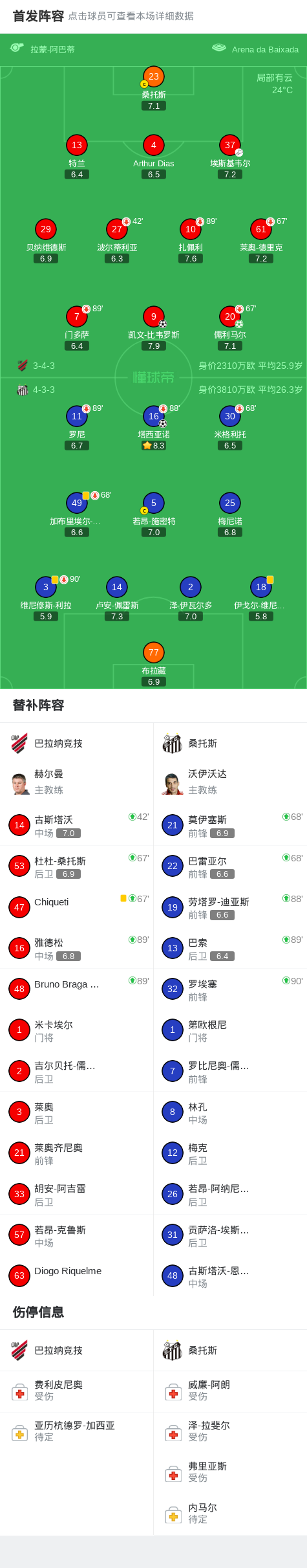 半场战报:巴拉纳竞技1-1桑托斯,儒利马尔点射,塔西亚诺破门
