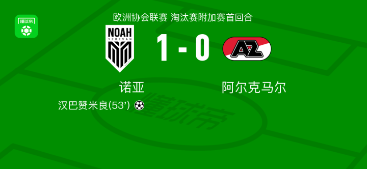北京时间2月20日欧洲协会联赛 淘汰赛附加赛首回合,诺亚对阵阿尔克马尔。诺亚汉巴赞米良破门。最终比分诺亚 1-0 阿尔克马尔。