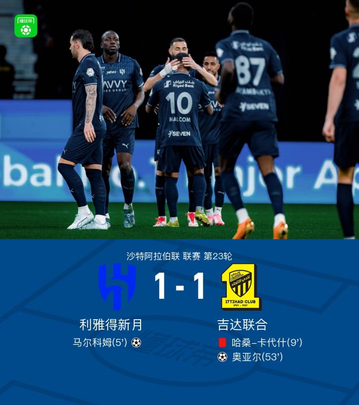 北京时间2月22日,沙特联第23轮,利雅得新月主场对阵吉达联合。比赛中,马尔科姆闪击,哈桑-卡代什染红,奥亚尔头槌扳平。最终,利雅得新月1-1十人吉达联合。