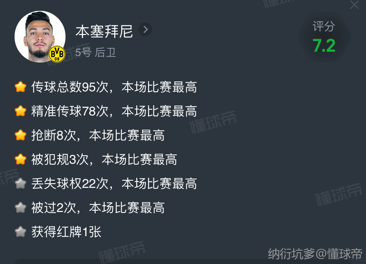 可以说对比赛进程而言,本赛拜尼丢失的球权是印象非常深刻的。像阿诺德这种长传能制造威胁的,有时候丢的球权多就算了。本赛拜尼本场丢失球权22次,要么是在组织进攻的时候随便一脚开到对方后防,要么就是反击或后场短传被断。他的糟糕传球直接打灭了多特上半场的攻势,即使是下半场进攻有所起势,本赛拜尼依旧用丢失球权成功拖延了多特的节奏。