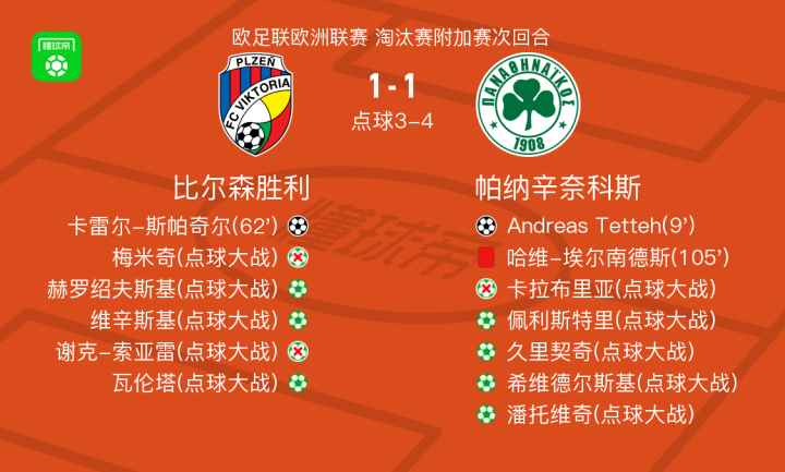 北京时间2月27日欧足联欧洲联赛 淘汰赛附加赛次回合,比尔森胜利对阵帕纳辛奈科斯。比尔森胜利卡雷尔-斯帕奇尔破门。帕纳辛奈科斯Andreas Tetteh破门。最终比分比尔森胜利 4-5 帕纳辛奈科斯。两回合总比分比尔森胜利6-7帕纳辛奈科斯。