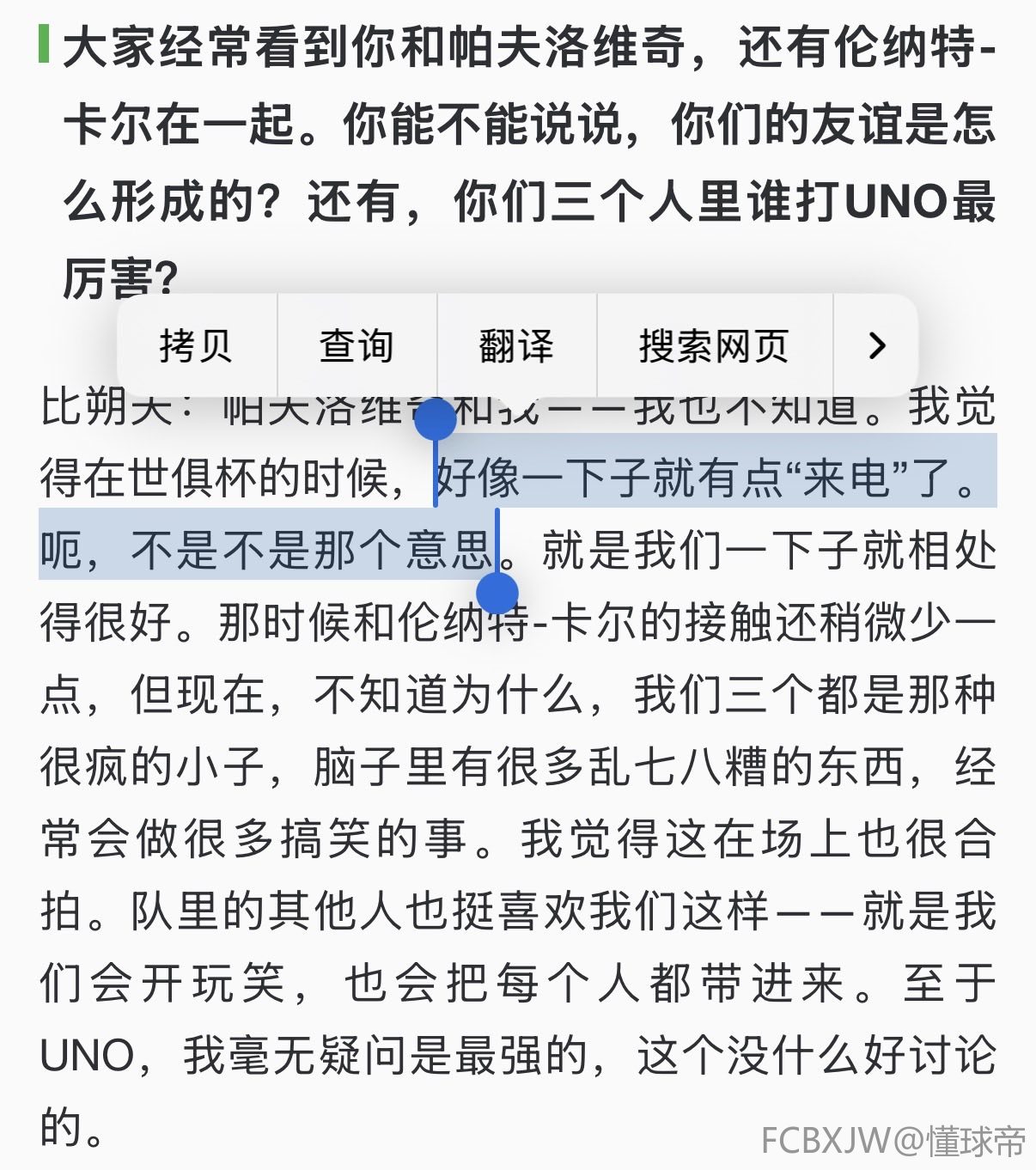 比朔夫:帕夫洛维奇和我——我也不知道。我觉得在世俱杯的时候,好像一下子就有点“来电”了。呃,不是不是那个意思。就是我们一下子就相处得很好。那时候和伦纳特-卡尔的接触还稍微少一点,但现在,不知道为什么,我们三个都是那种很疯的小子,脑子里有很多乱七八糟的东西,经常会做很多搞笑的事。我觉得这在场上也很合拍。队里的其他人也挺喜欢我们这样——就是我们会开玩笑,也会把每个人都带进来。至于UNO,我毫无疑问是最强的,这个没什么好讨论的。