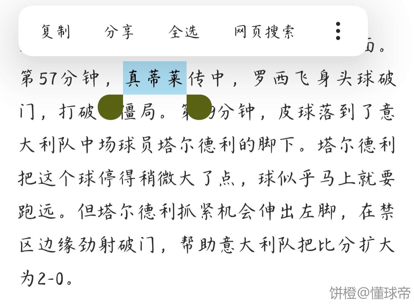 第81分钟,意大利队由布鲁诺-孔蒂发起了一次反击,阿尔托贝利左脚低射破门,帮助球队把比分扩大为了3-0。这几乎可以宣告意大利队已经锁定了胜局。当时,意大利总统佩尔蒂尼正在看台上观战。阿尔托贝利进球之后,佩尔蒂尼对着镜头得意地摇起了手指,对对手表达出“你们已经追不上我们了”的意思。