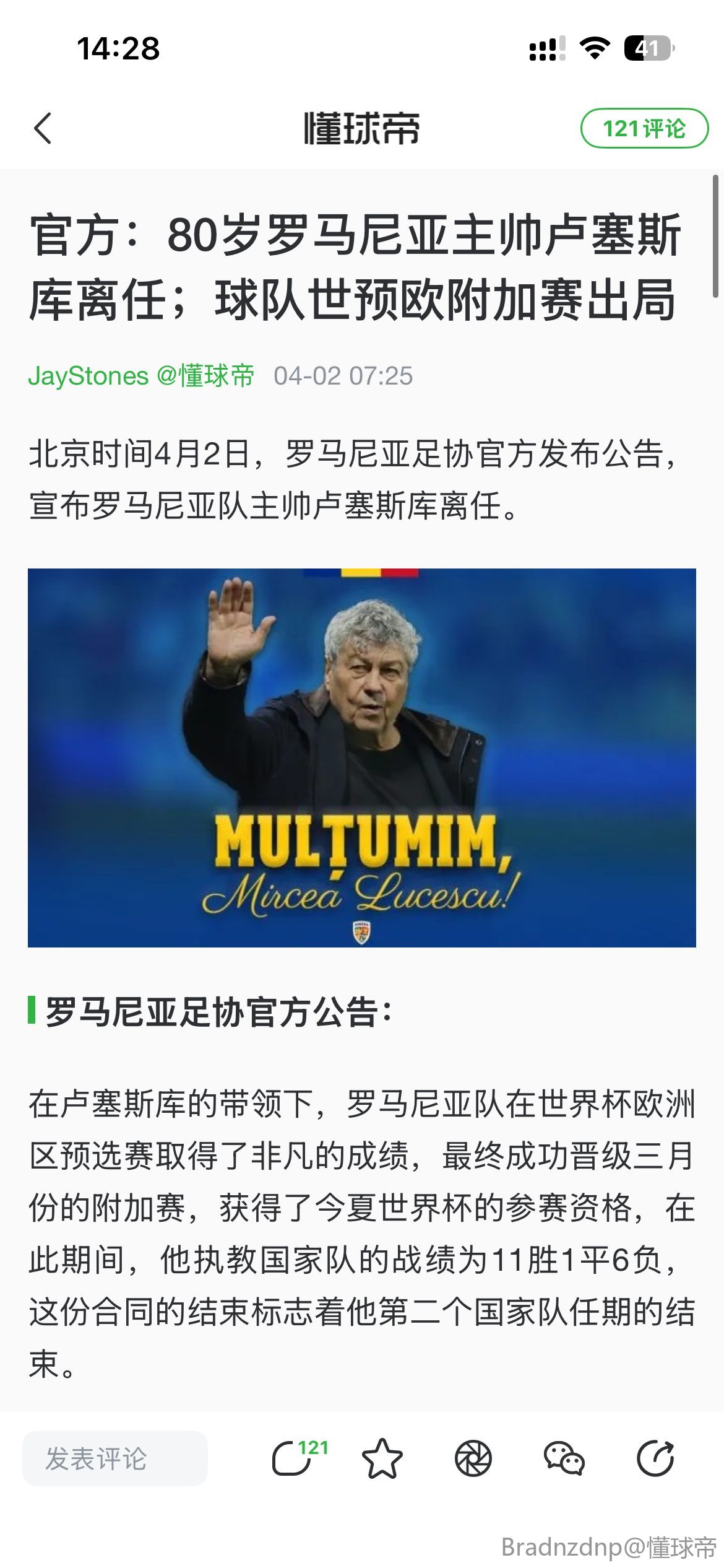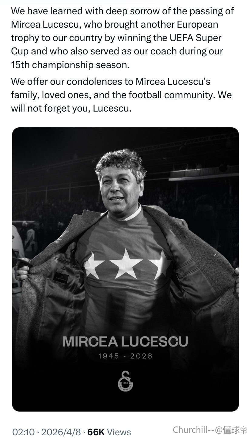 罗马尼亚足协对米尔恰-卢塞斯库的离世致以最深切的哀悼——他过去是、现在是、也将永远是罗马尼亚足坛无可争议的传奇。