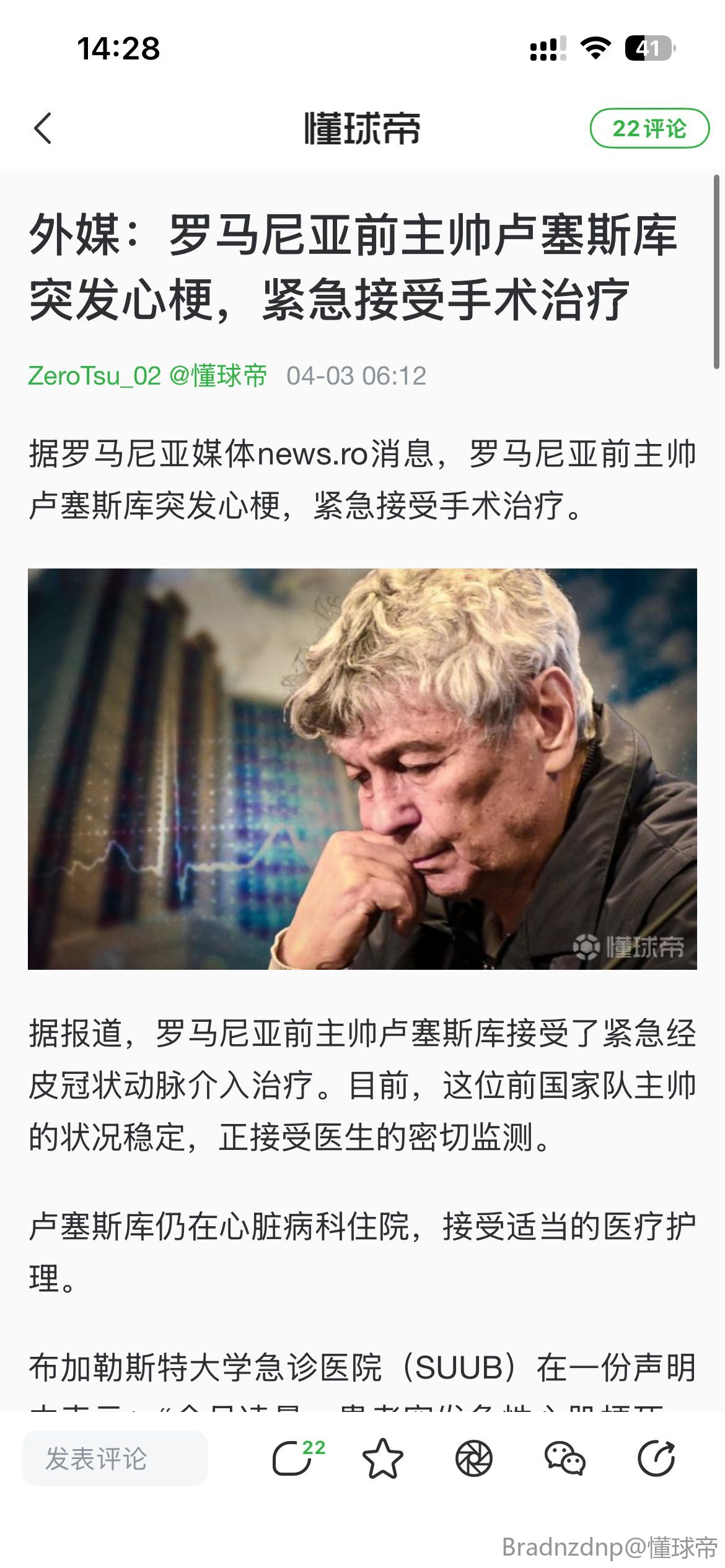 【外媒:罗马尼亚前主帅卢塞斯库突发心梗,紧急接受手术治疗】
