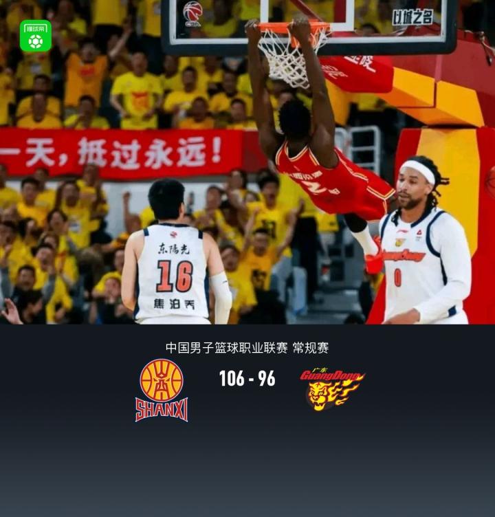 北京时间4月20日中国男子篮球职业联赛 常规赛,山西汾酒对阵广东东阳光。开场广东一度取得17-6领先,随后山西反扑追上比分,半场山西51-48广东,下半场山西多次将分差拉开,广东始终处于追分状态,最终山西106-96广东,广东彻底无缘常规赛前四。