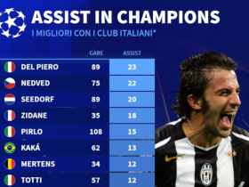 意甲球员欧冠历史助攻榜:皮耶罗、内德维德、西多夫前三