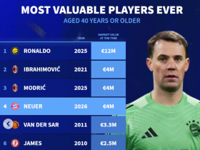 德转列史上40+岁球员身价榜:C罗1200万欧断层领先,伊布次席