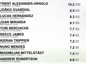 五大联赛后卫每90分钟向前传球:阿诺德居首,格瓦次席