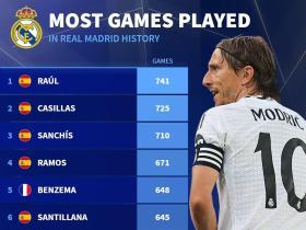 皇马队史出场次数排行榜:莫德里奇590场位列第9