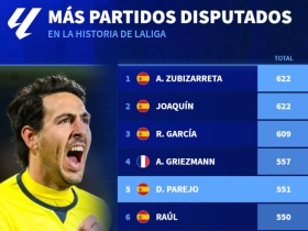 524场,格列兹曼独占西甲历史球员出场榜第8位