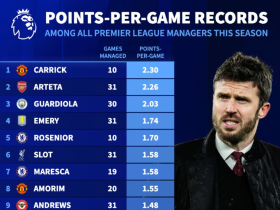 本赛季英超主帅场均积分:卡里克2.3分第1,图多尔、澳波垫底