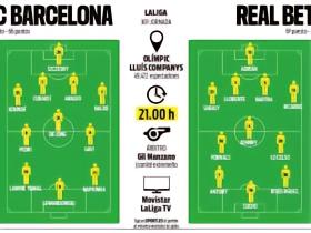 每体预测巴萨vs贝蒂斯首发:亚马尔、阿劳霍、安东尼在列