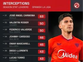 西甲拦截排行榜:何塞-安赫尔、罗齐尔、巴尔韦德列前三