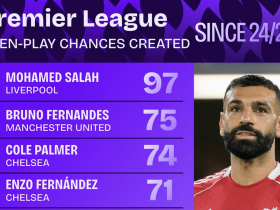 自上赛季以来英超运动战创造机会榜:萨拉赫居首,B费第二