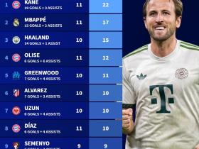 德转列五大联赛球员目前制造进球TOP10:凯恩造22球居首