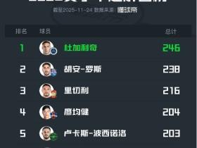 2025中超解围榜:杜加利奇以246次居首;本土球员廖均健最多