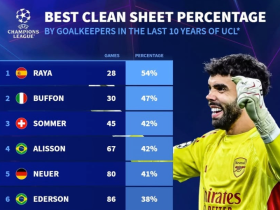 近10年欧冠门将零封率:拉亚54%第1,布冯47%第2,奥纳纳上榜
