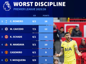 本赛季英超纪律榜:克里斯蒂安-罗梅罗8黄2红得牌最多