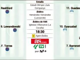 阿斯预测巴萨vs皇社首发:莱万、拉什福德领衔,什琴斯尼先发