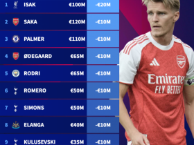 英超身价跌幅榜:伊萨克下跌2000万欧,萨卡、帕尔默下跌1000万欧