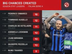 16次,迪马尔科是本赛季意甲截至目前创造绝佳机会最多的球员