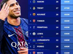 德转列右后卫身价榜:阿什拉夫8000万欧居首,阿诺德第二