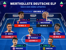 新一期德国队身价榜:维尔茨1.1亿第1,沃尔特马德6500万第2
