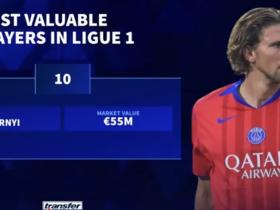 法甲身价更新:登贝莱重返1亿欧,维蒂尼亚9000万欧,巴黎包揽前11